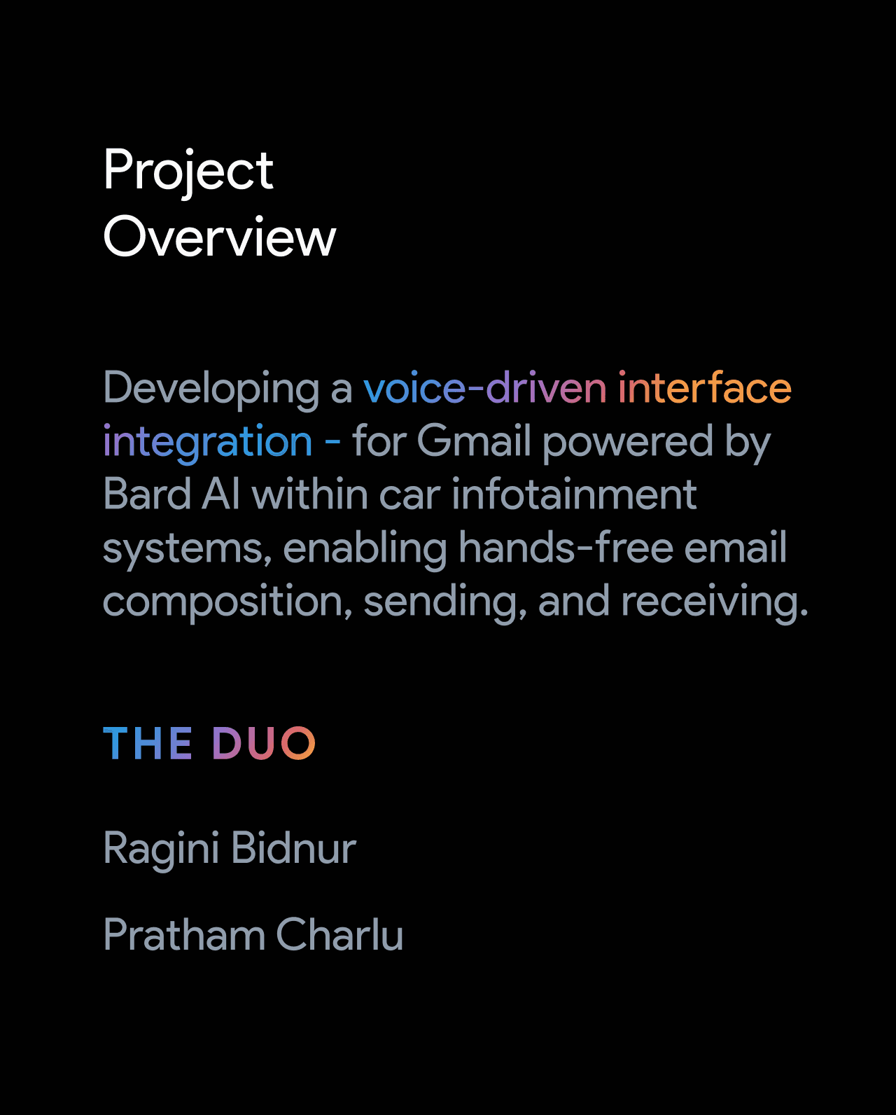 Developing a voice-driven interface integration - for Gmail powered by Bard AI within car infotainment systems, enabling hands-free email composition, sending, and receiving.